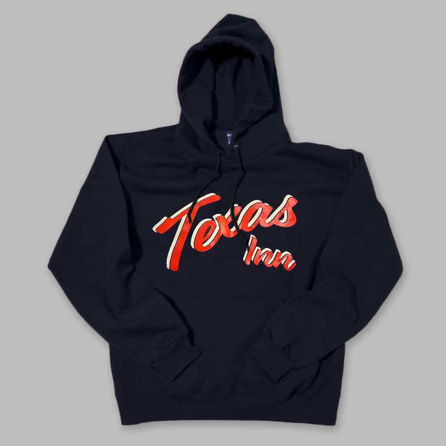 Our Texas Inn Hoodies are on sale now! Featuring our classic logo design on the front, with hood and big pocket front. Available in midnight blue, with red and white logo.